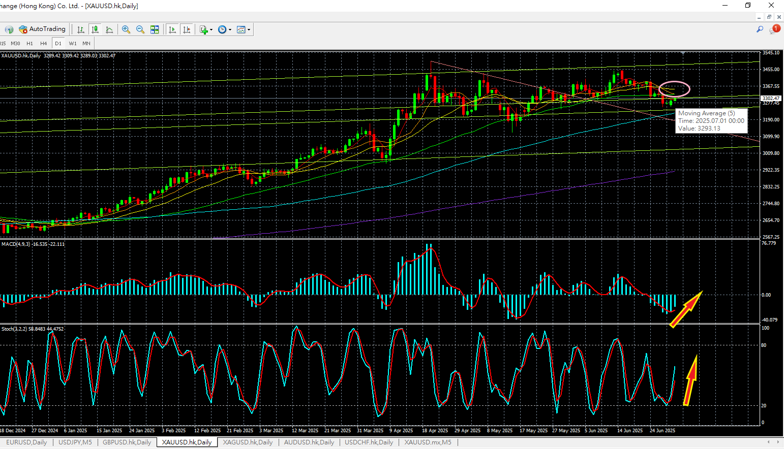 黃金經過多日調整後終於能高於5天sma 收市,加上震盪指標MACD 及 STC同步轉向,預期短期見底機會相當大,但能否重拾升勢關鍵在於是否突破3350一帶的阻力區。